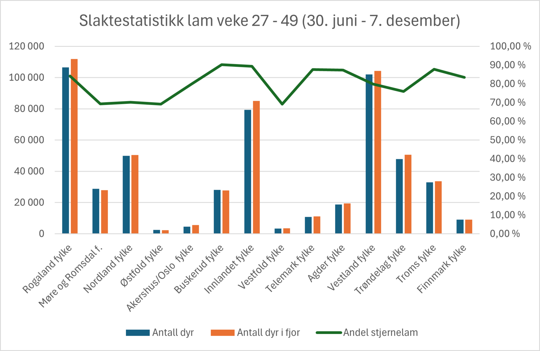 Nortura er godt fornøgd med det meste i årets slaktesesong. Nortura-sauebonden har levert lam med flott kvalitet, 19,13 kg i medel slaktevekt, 82 % Stjernelam og 61 % Gourmetlam er veldig bra og ein god framgang frå 2024. Dette er også viktig for slakteøkonomien og gode råvarer til både eigen industri og industrikundar.