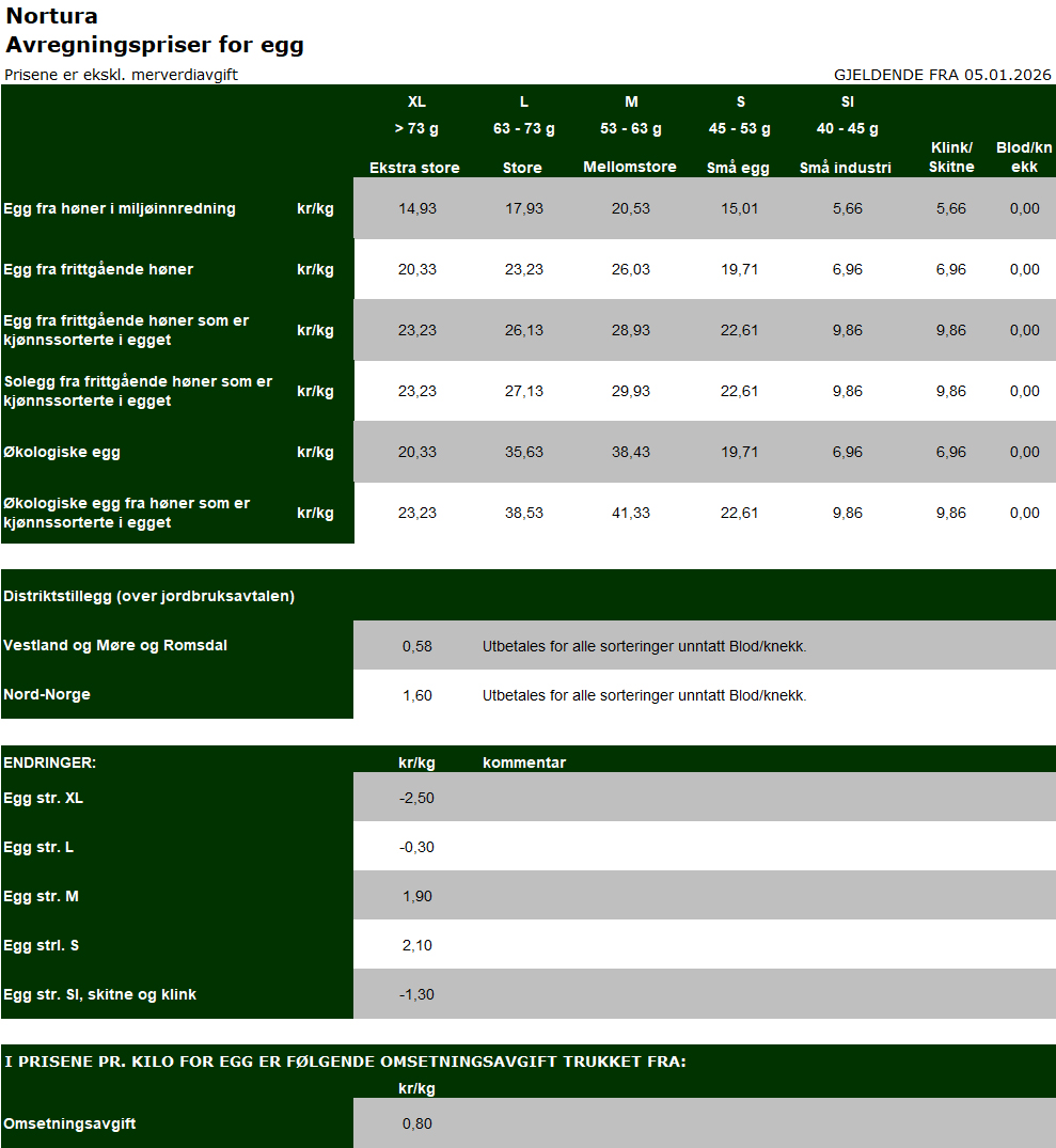(31.12.25) Avregningspris for egg går opp med kr 0,70 pr kg fra mandag 5. januar mens det blir en justering innenfor egg-størrelsene XL, L, M, S og SI. Se prislisten og medlemsnytt egg per 16. desember for mer informasjon.