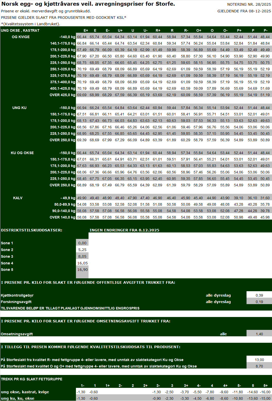 (05.12.25) Det er ingen endring i avregningspriser for storfe fra mandag 8. desember.