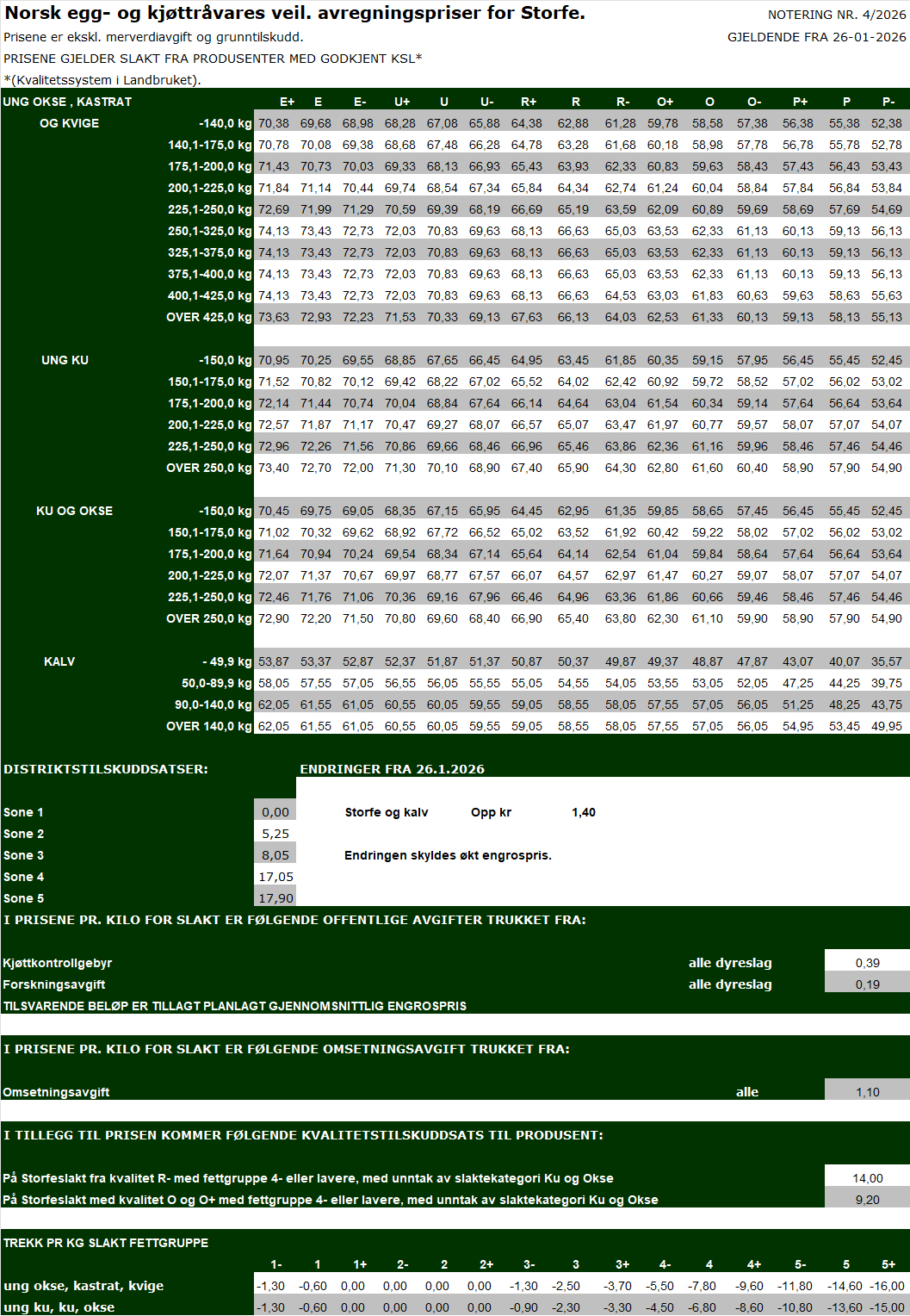 (23.01.26) Avregningsprisen for storfe går opp med kr 1,40 pr kg fra mandag 26. januar, dette som følge av økt engrospris. Det innføres et ekstra avtaletillegg på storfe med kr 3,00 pr kg uke 7-8. Alle storfe innmeldt på avtale og som slaktes f.o.m 26. januar t.o.m 27. februar får ekstra avtaletillegg.
